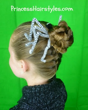 *Braided spider bun – Pipe cleaners, squiggly eyes and spider head pom pom (glued to a bobby pin.) Several hair elastics or hair ties.